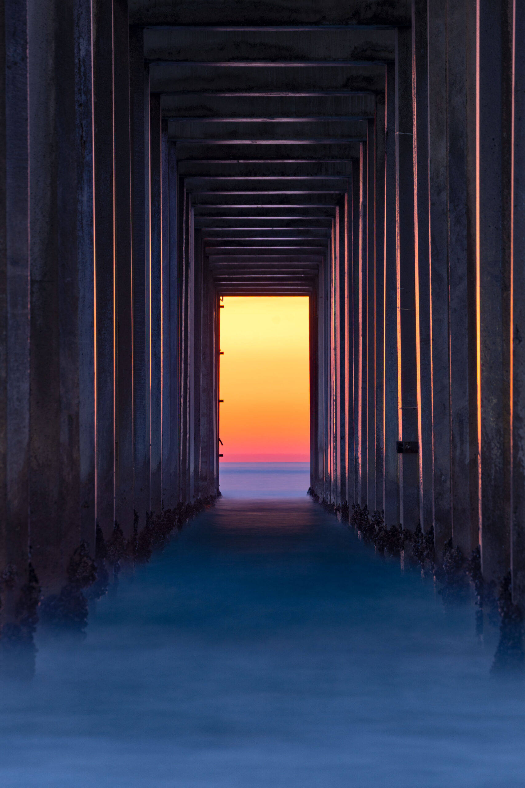 Close of Scripps Pier at sunset.